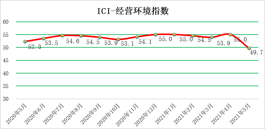 2021年5月份,中國工業(yè)綜合指數(shù)(以下簡稱ICI)為56.0%,環(huán)比回落2.1個百分點,有所回落,但自去年4月份以來連續(xù)位于榮枯線以上,表明中國工業(yè)經(jīng)濟總體持續(xù)恢復。生產(chǎn)狀況指數(shù)為65.3%,環(huán)比回落1.0個百分點,繼續(xù)保持高位,企業(yè)生產(chǎn)活動積極平穩(wěn)進行。效益狀況指數(shù)為48.2%,環(huán)比回落3.3個百分點,跌落于榮枯線之下,處于今年最低點。經(jīng)營環(huán)境指數(shù)為49.7%,環(huán)比回落5.3個百分點,跌落于榮枯線之下,經(jīng)營環(huán)境出現(xiàn)問題。融資難易指數(shù)為40.4%,環(huán)比回落6.6個百分點,持續(xù)位于榮枯線下方,且該指數(shù)大幅下降仍低于50%的均衡線,表明當前企業(yè)融資難融資貴的問題持續(xù)存在,亟需政府進行干預、發(fā)揮作用。預期發(fā)展指數(shù)為61.2%,環(huán)比回升2.8個百分點,大幅上漲且該指數(shù)依舊長期保持高位優(yōu)勢。ICI制造業(yè)指數(shù)為57.1 %,環(huán)比回落3.8個百分點,繼續(xù)處于高位,自去年4月份以來連續(xù)位于榮枯線以上,表明制造業(yè)總體持穩(wěn)定復蘇。