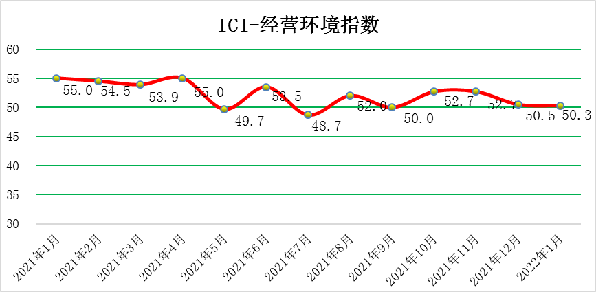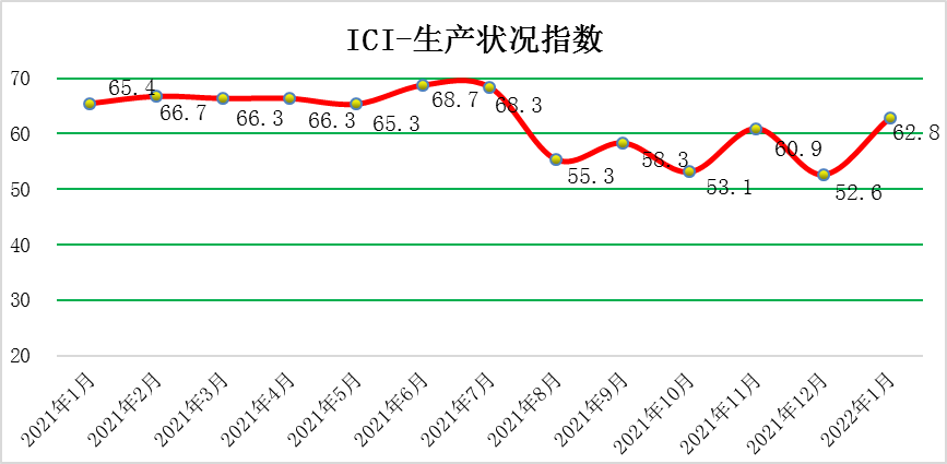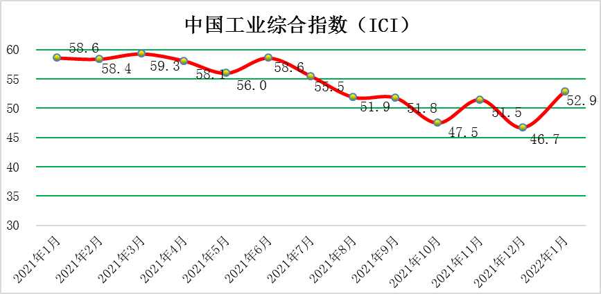 2022年1月份,中國工業(yè)綜合指數(shù)(以下簡稱ICI)為52.9 %,環(huán)比回升6.2個百分點,漲至榮枯線之上,表明中國工業(yè)經(jīng)濟(jì)運(yùn)行有所改善。生產(chǎn)狀況指數(shù)為62.8 %,環(huán)比回升10.2個百分點,較大回升且遠(yuǎn)高于榮枯線,企業(yè)生產(chǎn)擴(kuò)張態(tài)勢更加明顯。效益狀況指數(shù)為52.2 %,環(huán)比回升16.8個百分點,較大回升,時隔六個月后重回榮枯線之上,企業(yè)效益狀況明顯好轉(zhuǎn)。經(jīng)營環(huán)境指數(shù)為50.3 %,環(huán)比回落0.2個百分點,高于榮枯線,經(jīng)營環(huán)境持續(xù)改善。融資難易指數(shù)為45.5 %,環(huán)比回落1.9個百分點,小幅回落,繼續(xù)位于榮枯線下方,表明當(dāng)前企業(yè)融資難融資貴的問題依然存在,政府如何進(jìn)行維系、如何持續(xù)發(fā)揮作用依然是至關(guān)重要的。預(yù)期發(fā)展指數(shù)為56.9%,環(huán)比回升5.4個百分點,有所回升,繼續(xù)位于榮枯線之上,企業(yè)預(yù)期持續(xù)向好。ICI制造業(yè)指數(shù)為52.1%,環(huán)比回升6.0個百分點,制造業(yè)擴(kuò)張回暖。