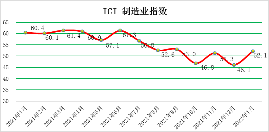 1月份ICI制造業(yè)指數(shù)為52.1%,環(huán)比回升6.0個百分點,漲至回榮枯線之上。1月份,中國制造業(yè)采購經(jīng)理指數(shù)(PMI)為50.1%,比上月回落0.2個百分點,高于臨界點,制造業(yè)擴(kuò)張步伐有所放慢。