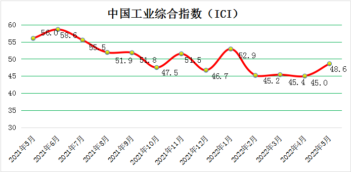 2022年5月份,中國工業(yè)綜合指數(shù)(以下簡稱ICI)為48.6 %,環(huán)比回升3.6個百分點,繼續(xù)位于榮枯線之下,表明中國工業(yè)經(jīng)濟(jì)運(yùn)行受疫情影響仍承壓但有所好轉(zhuǎn)。生產(chǎn)狀況指數(shù)為49.2 %,環(huán)比回升6.8個百分點,繼續(xù)位于榮枯線之下,企業(yè)生產(chǎn)延續(xù)收縮態(tài)勢。效益狀況指數(shù)為47.9 %,環(huán)比回升7.7個百分點,有所回升,但仍低于榮枯線,企業(yè)效益狀況不佳。經(jīng)營環(huán)境指數(shù)為47.9 %,環(huán)比回落0.6個百分點,近七月連續(xù)回落,繼續(xù)位于榮枯線之下,經(jīng)營環(huán)境問題繼續(xù)存在。融資難易指數(shù)為50.0 %,環(huán)比回升7.0個百分點,與榮枯線持平,表明當(dāng)前企業(yè)融資難融資貴的問題有所改善,政府如何進(jìn)行維系、如何持續(xù)發(fā)揮作用依然是至關(guān)重要的。預(yù)期發(fā)展指數(shù)為52.0 %,環(huán)比回升2.5個百分點,有所回落,漲至榮枯線之上,企業(yè)預(yù)期有所好轉(zhuǎn)。ICI制造業(yè)指數(shù)為47.7%,環(huán)比回升3.8個百分點,制造業(yè)運(yùn)行情況有所改善。