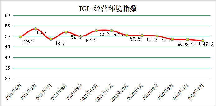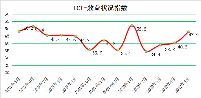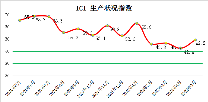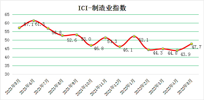 5月份ICI制造業(yè)指數(shù)為47.7%,環(huán)比回升3.8個百分點,繼續(xù)位于榮枯線之下。