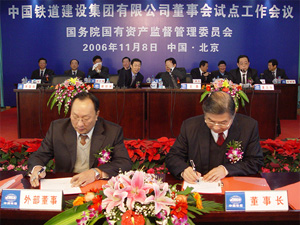 2006年11月8日,國務院國資委在京召開中國鐵道建設集團有限公司(以下簡稱中國鐵建)董事會試點工作會議。國務院國資委黨委副書記、副主任王勇出席會議。王勇代表國務院國資委向中國鐵建外部董事頒發聘書,中國鐵建與外部董事簽訂服務合約。中國鐵建董事會由六位外部董事和五位非外部董事組成,外部董事為:吳曉華、李克麟、李克成、趙廣杰、陶瑞、項兵;非外部董事為:中國鐵建董事長、黨委書記李國瑞,副董事長丁原臣,董事、總經理金普慶同志,董事霍金貴同志,職工董事彭樹貴。至此,中國鐵建董事會試點工作正式啟動,中國鐵建建立現代企業制度、完善法人治理結構工作進入了新階段。隨后,王勇代表國資委就中國鐵建董事會試點工作發表講話。