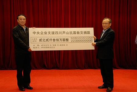 4月25日下午,在中央企業支援四川蘆山抗震救災(第二批)捐款儀式上,國資委黨委副書記、副主任黃淑和表示,中央企業和四川人民一起,同心同德、眾志成城,奪取抗震救災和災后重建的新勝利。四川省副省長劉捷對中央企業積極參與抗震救災并向災區捐款表示感謝,稱贊中央企業是四川抗震救災的重要力量和生力軍。中國電建黨委書記晏志勇代表中央企業發言,介紹了企業抗震救災的具體情況。