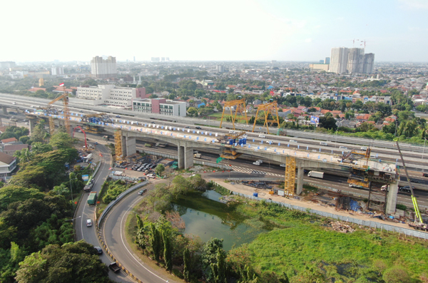 同樣在當天下午合龍的DK15連續梁,是水電八局承擔的1號梁場萬隆至雅加達小里程方向架梁通道上的控制性工程,也是跨度布置為40+64+45+64+40米的連續5跨剛構連續梁。全長253米,共分為4個T形結構、52個節段,是全線連續跨度最多的連續梁。建設者克服了連續梁跨越兩處車密度大的高速公路匝道等高風險施工難題,克服了疫情帶來的不利影響,為小里程方向架梁通道的貫通,奠定了良好的基礎。