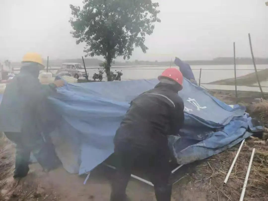 受強對流天氣影響,紅旗分公司小麥、蔬菜、龍蝦塘以及桃園等大面積受損嚴重。暴風雨過后,紅旗分公司黨支部連夜成立了應急搶險小組,第一時間趕赴現場實施救援。得知2個外地來場養殖龍蝦的養殖戶管理板房被狂風卷走,應急搶險小組連夜調集物資,冒雨加班加點搭建臨時救災帳篷,讓受災戶有了安身之地。