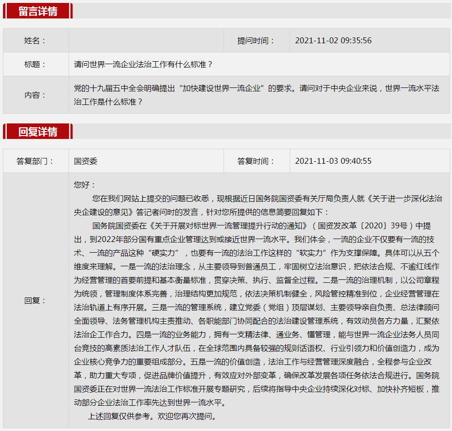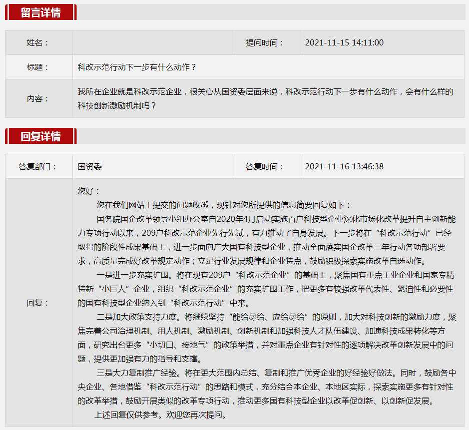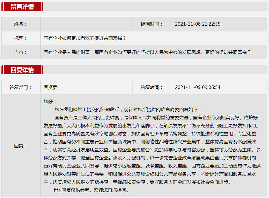 2021年11月國資委網站政務咨詢欄目部分網友提出的咨詢,我們初步做出了認真的回應,現選擇五條關注度高、點擊量高的問題,再次推薦分享。