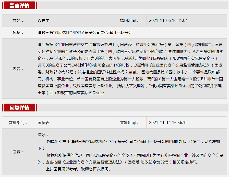 2.請教國有實際控制企業的全資子公司是否適用于32號令?