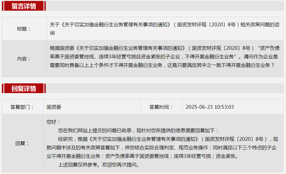 4.關于《關于切實加強金融衍生業務管理有關事項的通知》(國資發財評規〔2020〕8號)相關政策問題的咨詢