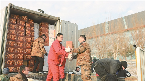 圖為新疆油田員工從物流車上卸運和搬送采購于托里縣的農副特色產品。 張革新 攝