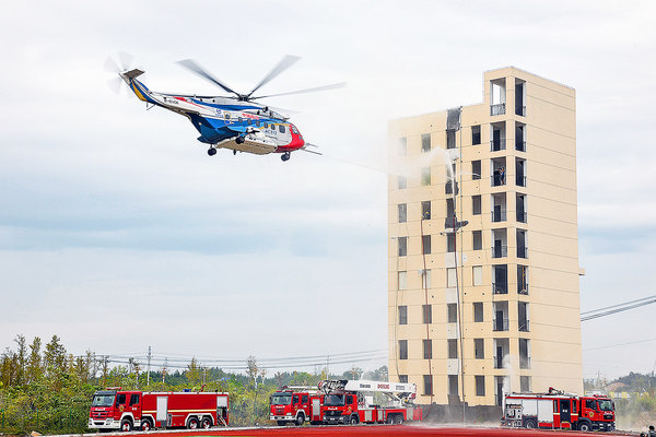 9月1日,消防水炮滅火驗證試飛在景德鎮消防特勤大隊舉行。AC313直升機從呂蒙機場出發,在昌江河邊進行了取水。完成取水后,AC313迅速飛抵火點,空中盤旋觀察后,操控員開啟水炮,水柱從炮管中噴涌而出,大樓7層的火點迅速被撲滅。兩架AC311直升機也參加了驗證試飛,分別擔負空中航拍、搶運傷員的任務。