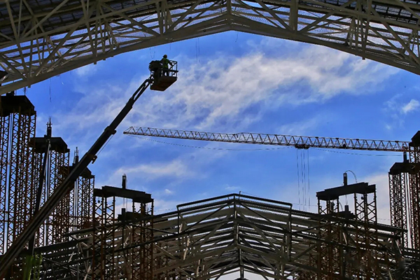 星火站鋼結構屋蓋,采用大跨度空間鋼桁架結構,整個屋蓋桁架面積4.2萬平方米,由多達1.5萬根桿件焊接而成,重達2450噸,安裝高度37米。鋼結構區域南北兩側的鋼筋混凝土結構雨棚上蓋停車場,是全國首例也是全國面積最大的鋼結構屋蓋施工,分布廣、噸位大、跨度大,施工精度要求高。屋蓋設計構造為大跨度空間魚腹式倒三角管桁架體系,截面變化大、節點復雜,32根雙傾斜梭形斜柱安裝,采用逆作業施工法,安裝難度不亞于“刀尖起舞”,斜柱頂部鑄鋼件安裝工序緊密銜接,偏差控制在2°以內。