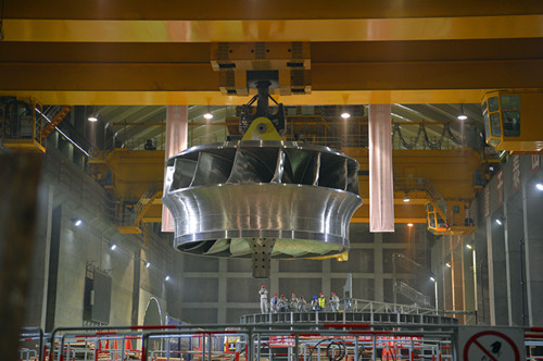 6月21日10時(shí)許,白鶴灘水電站左岸1號機(jī)轉(zhuǎn)輪——全球首臺(tái)百萬千瓦水電機(jī)組“心臟”在1300噸橋機(jī)的牽引下平穩(wěn)上升,經(jīng)過約300米的水平移動(dòng),于11時(shí)許抵達(dá)1號機(jī)機(jī)坑正上方,隨后開始緩緩下降并成功就位。