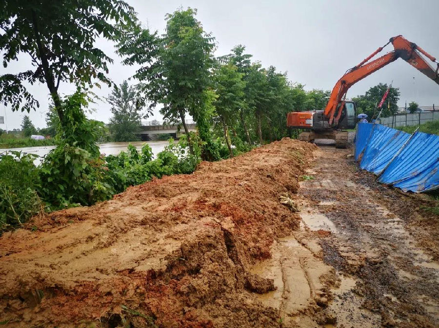 7月6日,臨近中交四公局鄂州三江港項目的螺螄港水位急劇上漲,最低處河水水位距離堤頂不足10厘米,隨時可能發生漫堤險情。接到通報后,鄂州三江港項目立即啟動抗洪搶險應急預案,組織項目全體人員開展應急搶險工作,調動挖掘機填高河堤并裝碼沙袋加固,經過不間斷的人機配合,壘起了一條高60厘米,長80米的河堤,保障了項目及周邊兩個村莊村民的生命財產安全。