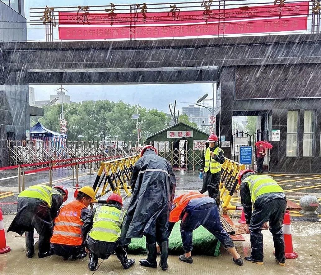 7月7日高考第一天,中交二航局馬影河項目在接到武漢市漢南區水務和湖泊局通知后,按防汛應急救援工作部署,立即組建防汛應急救援搶險隊,火速趕往漢南一中校門口,在積水處搭建了一座簡易的小型“浮橋”,保證考生順利進入考場。同時,項目部調集五臺抽水泵,排除校園洼地積水。