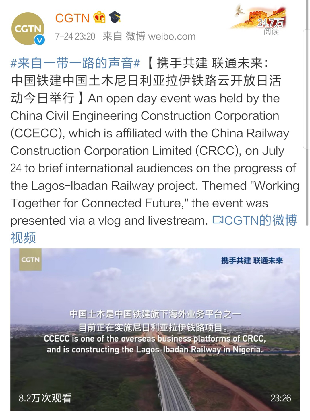 7月24日,中國鐵建所屬中國土木集團承建的尼日利亞拉伊鐵路推出云開放日活動,活動以“攜手共建 聯通未來”為主題,多角度立體化呈現了西非首條中國標準雙線鐵路拉伊鐵路的建設進展以及當地員工復工復產的生活狀態。