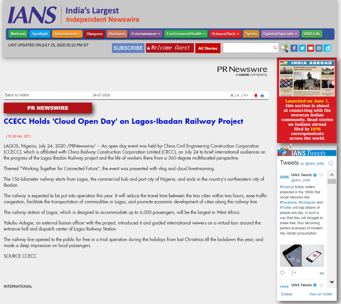 同時,尼日利亞拉伊鐵路云開放日還受到海外媒體,尤其是非洲媒體的廣泛報道。南非新聞報刊(AllAfica)、美通社(PR Newswire)、亞洲通訊社(IANS)、非洲商業網(Africa Business)、曼哈頓周報(Manhattanweek)、納米比亞通訊社(Namibia Press Agency)等20家來自英國、印度、澳大利亞、尼日利亞、美國,以及非洲地區的國際媒體對活動日給予大力報道,覆蓋國際受眾154萬余人。引發包括彭博新聞、彭博社阿聯酋辦事處、華爾街日報中文版等在內的108家國際媒體對拉伊鐵路云開放日的關注興趣。