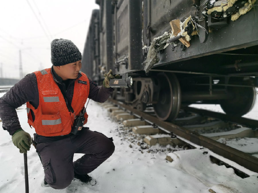 作為近年來最冷的一個冬天,全副武裝的職工張志新早已習慣,棉衣棉褲棉鞋,脖套線帽皮手套,披著一身戰甲,在沒有風的凌晨,還是凍的瑟瑟發抖。“接車比較冷,一動不動地站著,待會檢修的時候就渾身冒汗了。”等待接車的間隙,他說道。