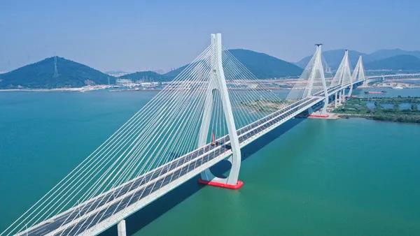 據(jù)悉,洪鶴大橋是連接珠海香洲區(qū)和金灣區(qū)的過江通道,起于香洲區(qū)南屏鎮(zhèn)洪灣樞紐互通,對(duì)接港珠澳大橋連接線,終點(diǎn)與鶴港高速相接,路線全長約9.65公里,采用雙向六車道標(biāo)準(zhǔn)建設(shè)。大橋主橋由兩座主跨500米雙塔雙索面疊合梁斜拉橋串聯(lián)而成,兩座斜拉橋均采用“水滴形”鋼筋混凝土橋塔、鋼—混凝土結(jié)合主梁、鋼絞線斜拉索等結(jié)構(gòu),較好地滿足橋址處強(qiáng)風(fēng)、強(qiáng)震、軟土及海洋腐蝕環(huán)境下的使用要求。