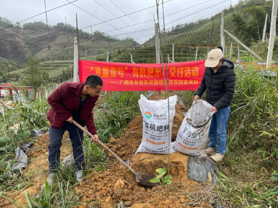 3月12日,正當樂業(yè)縣新化鎮(zhèn)的農(nóng)戶們在那娥獼猴桃基地忙碌時,一輛滿載“禾能壹號”有機肥的運輸車從中國廣核集團(簡稱“中廣核”)重大科技扶貧項目——廣西樂業(yè)有機資源綜合開發(fā)扶貧項目(簡稱“項目”)廠區(qū)出發(fā),運往那娥獼猴桃基地。這意味著項目第一批“禾能壹號”有機肥正式出廠并交付使用。而首站要去的那娥獼猴桃基地,位于“時代楷模““全國脫貧攻堅楷模”黃文秀同志生前所在的百坭村。