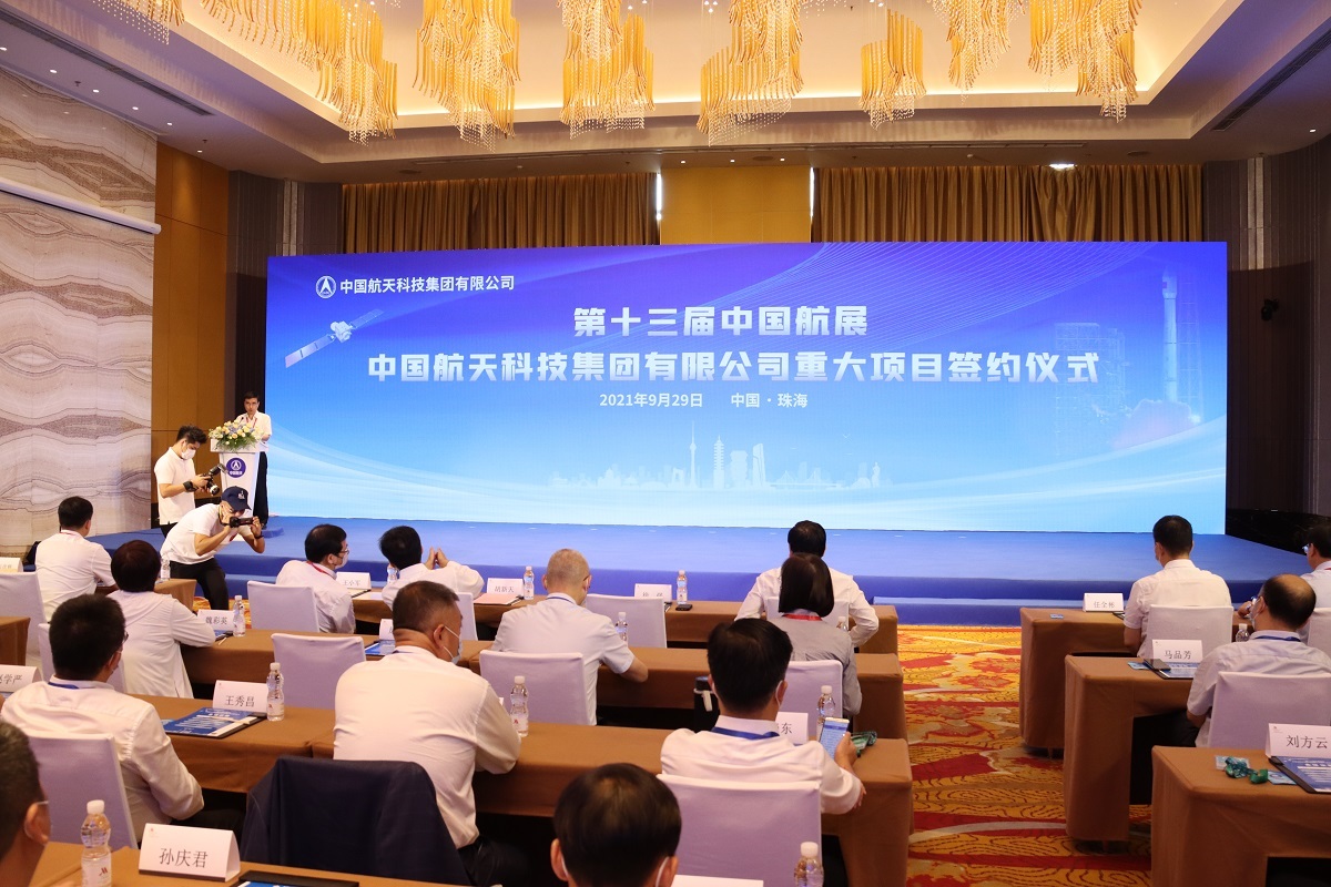 9月29日,在第十三屆中國國際航空航天博覽會(珠海航展)上,中國航天科技集團有限公司舉行重大項目簽約儀式,與國家相關部門、地方政府、企業集團等簽署了50余項合作協議及合作意向,累計簽約金額近500億元,再創集團公司珠海航展簽約金額歷史新高。