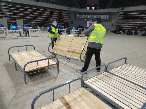 華潤(rùn)置地志愿者在上海靜安體育中心方艙醫(yī)院作業(yè)