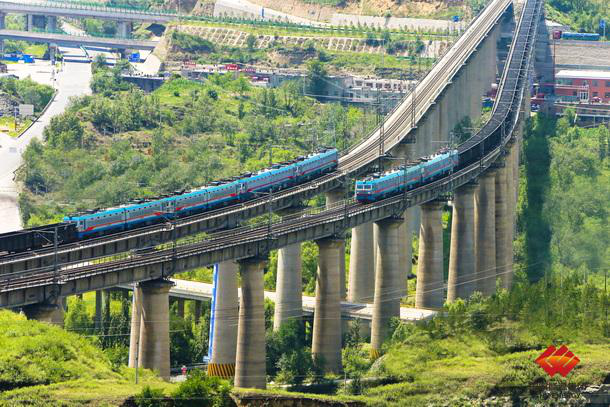 圖為萬噸重載列駛過國家能源集團神朔鐵路孤山川大橋