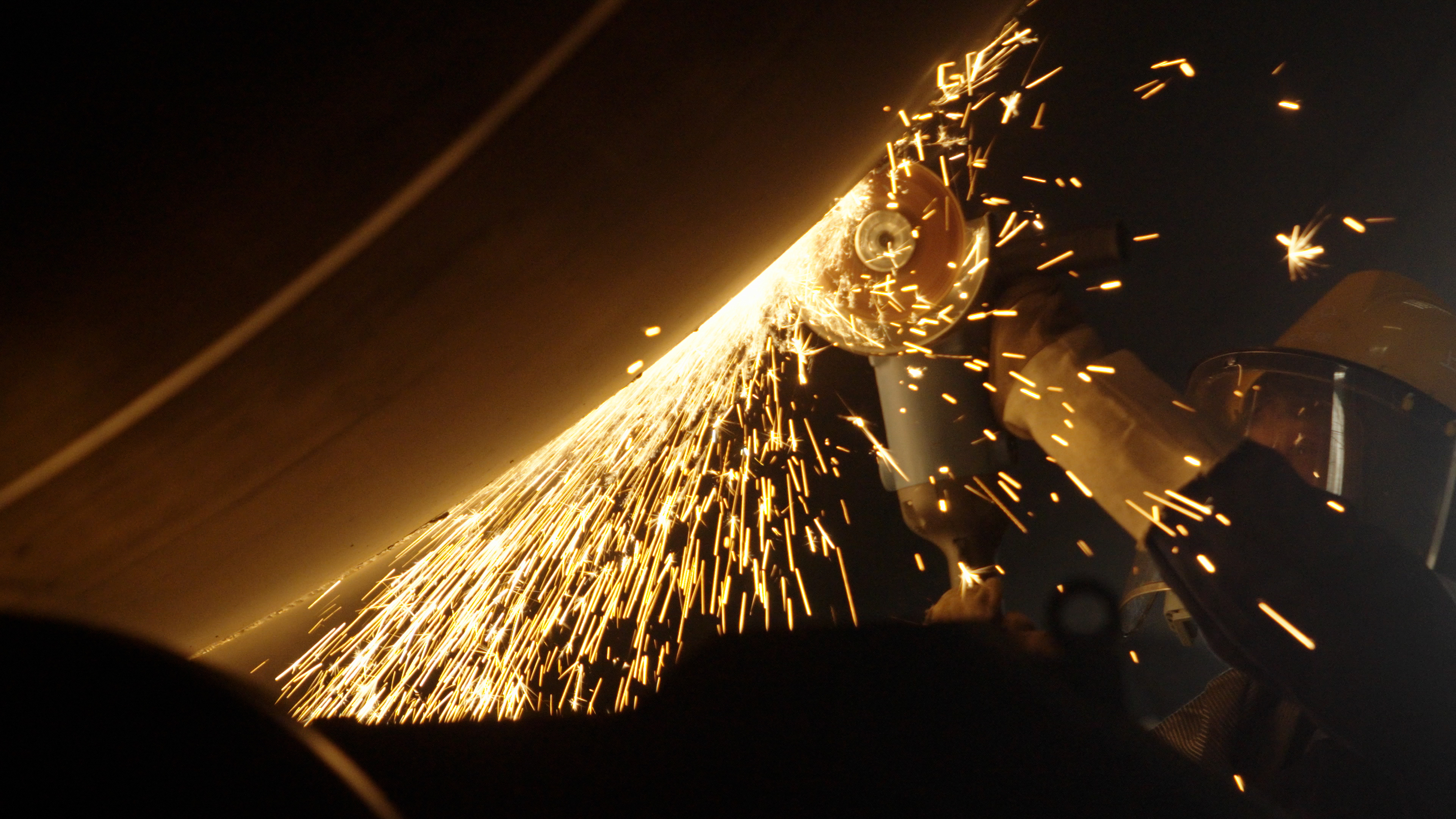 建設人員正在焊接陽江三山島海上風電柔直輸電工程海上平臺導管架連接件