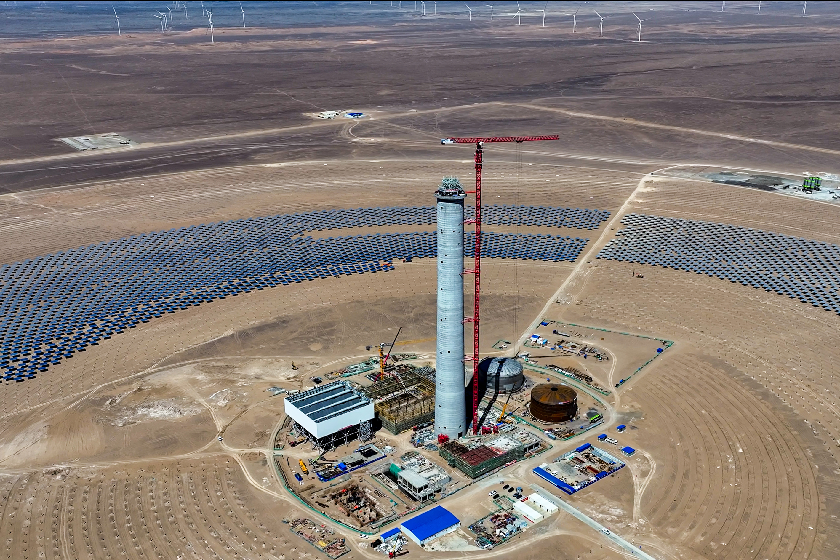 據介紹,該項目計劃2027年6月完工。本次澆筑的汽輪機基礎是光熱電站的核心結構,投運后需承載數千噸設備重量及高頻振動荷載。此次澆筑混凝土方量600立方米,屬于大體積混凝土澆筑,基礎需嵌入大量預埋件、螺栓孔,施工精度直接影響設備安裝定位。項目位于世界最大風區之一,不僅被多個千萬千瓦級大型風電場環抱,還需直面荒漠極端環境的嚴酷考驗——建設環境惡劣,氣候變化大,冬季氣溫低至零下40℃,交通不便,生產生活物資供給困難,年施工窗口期僅7個月。為此,投資集團動員項目全體參建單位及員工發揮勇于擔當、敢為人先的能建精神,凝聚基層黨支部的集體力量。在項目現場成立施工現場聯合黨支部,順利按期實現吸熱塔筒體封頂及首片定日鏡安裝的工程節點目標。這座計劃于2026年7月全容量并網的超級工程,正將荒漠陽光轉化為穩定綠電。