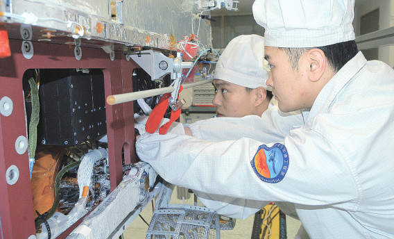 總裝人員正在進行月球巡視器測試的狀態設置工作