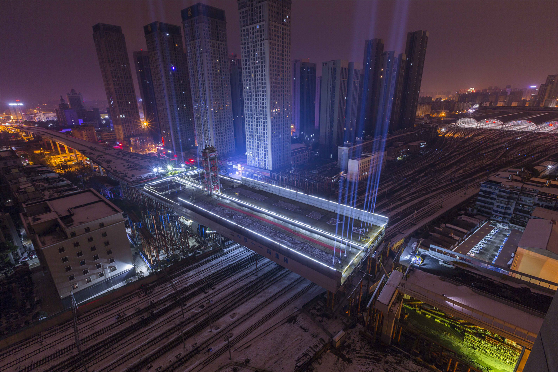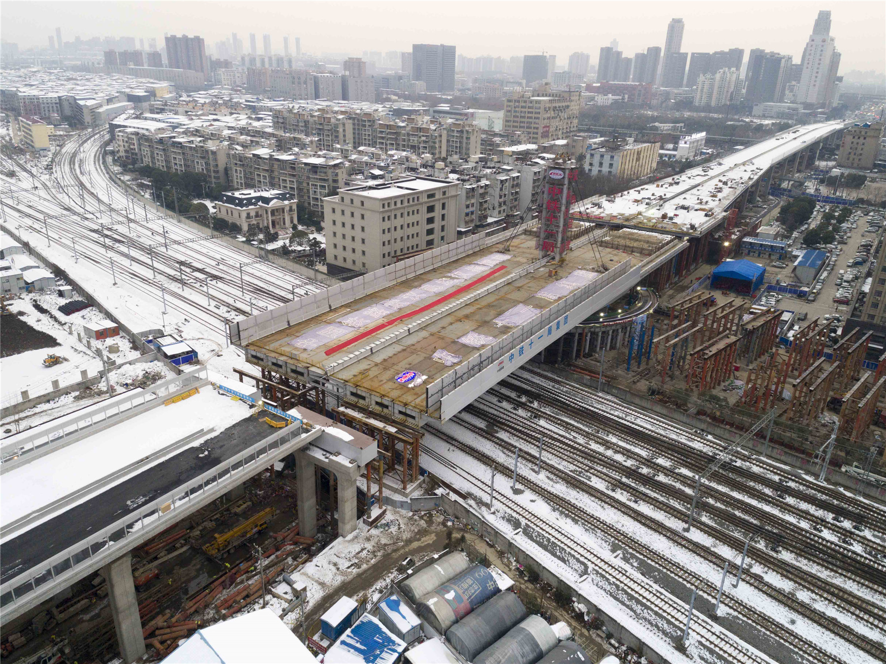 1月31日凌晨3時4分,由中國鐵建所屬中鐵十一局二公司承建的武漢市常青路主線轉(zhuǎn)體橋歷時103分鐘順時針轉(zhuǎn)動81度,跨越漢口火車站西咽喉岔區(qū)9股道,與引橋?qū)崿F(xiàn)精準(zhǔn)對接,順利合龍,刷新了轉(zhuǎn)體最不平衡、轉(zhuǎn)體橋面最寬、跨越特等站鐵路股道數(shù)最多三項轉(zhuǎn)體橋世界紀(jì)錄。