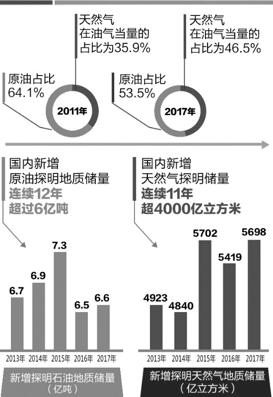 高質(zhì)量油氣供給最顯著的特征是結(jié)構(gòu)更加合理。近年來,中國石油國內(nèi)勘探開發(fā)從油氣并舉向加快天然氣發(fā)展轉(zhuǎn)變,天然氣勘探投入從原來1/3上升為1/2。天然氣在中國石油油氣業(yè)務(wù)中的占比由2011年35.9%上升為2017年46.5%。上半年國內(nèi)天然氣產(chǎn)量同比增長3.4%,占全國產(chǎn)量的七成以上,為我國經(jīng)濟發(fā)展持續(xù)提供清潔能源。