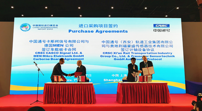 11月7日,中國通號交易分團參加首屆中國國際進口博覽會中央企業集中簽約活動,中國通號旗下卡斯柯公司、西安工業集團與來自德國、法國、瑞士、奧地利的供應商進行了采購簽約。其中,卡斯柯公司與德國MEN公司、法國森拓公司、瑞士哈斯勒公司就地鐵列控系統車載板卡、司機顯示單元、列車測速裝置等設備簽署了2份采購合同和1份采購協議;西安工業集團與奧地利福豪盛傳感器技術有限公司、德國埃莎庫爾特機電設備(上海)有限公司就軌道交通計軸設備、工業波峰焊工業裝備簽署了1份采購協議和1份采購合同。