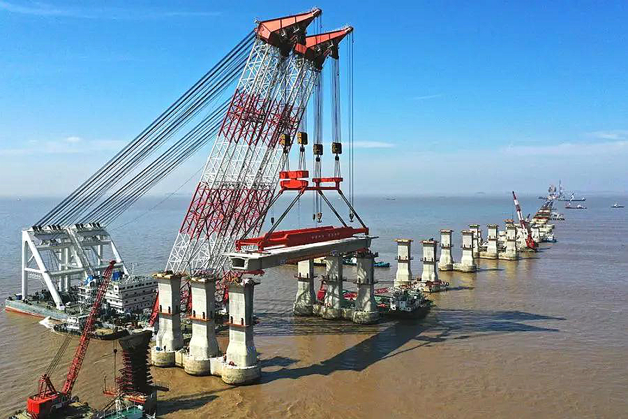 4月18日,一榀長(zhǎng)69米、寬12.55米、重達(dá)1800余噸的預(yù)制箱梁,被四航奮進(jìn)號(hào)2600噸起重船緩緩提起,安全、精準(zhǔn)地落至寧波舟山港主通道舟岱跨海大橋NZ24號(hào)和NZ25號(hào)墩上。至此,浙江省交通集團(tuán)成功完成首榀全國(guó)最重最長(zhǎng)跨海大橋預(yù)制箱梁架設(shè)。