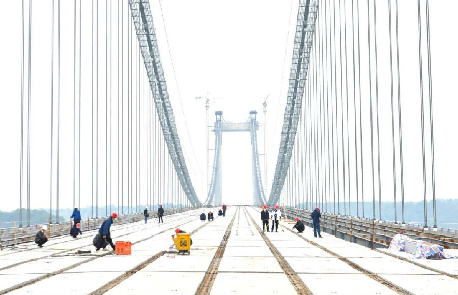 湖北交投集團投資建設的白洋長江公路大橋項目工地,首批返崗的橋面施工作業隊正在進行橋面板吊裝焊接施工作業。這是繼赤壁長江大橋建設項目復工后,湖北交投又一個復工的長江大橋項目。