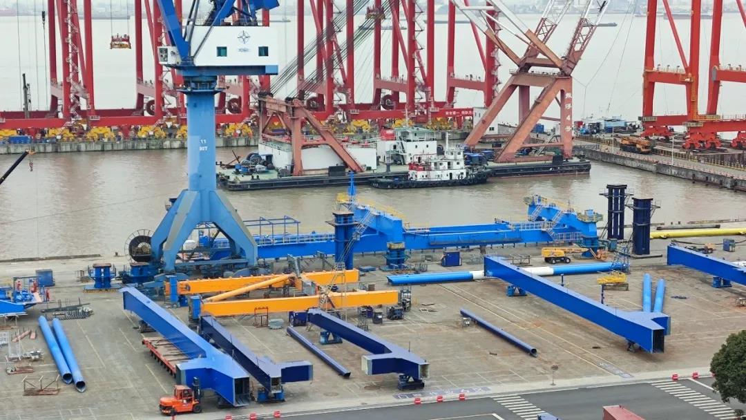 近日,上海振華重工公司長興島基地,北部灣港欽州大欖坪南作業區7-8號泊位集裝箱改造項目第一臺自動化雙小車岸橋完成門框吊裝,標志著項目岸橋由結構制造開始進入核心的總裝階段。