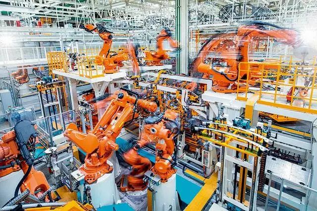 江淮蔚來先進(jìn)制造基地內(nèi)的機(jī)械臂正進(jìn)行全鋁車身連接