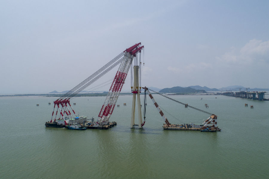 大橋的鋼塔全部采取工廠化制造。架設時,先在1200噸浮吊的配合下,利用我國自主研制的目前最大起重量為3600噸的雙臂浮吊完成鋼塔空中翻轉、豎轉至鉛錘狀態后,再吊至橋墩上方,與橋墩鋼箱梁頂面預留節段精確對位。