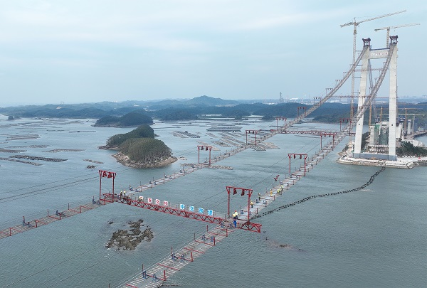 受濱海強季風氣候影響,主纜架設面臨高空作業安全風險大、精確定位難度高、牽引架設效率低等問題,項目建設者們充分利用深夜溫差小的窗口期,使用4臺高精度GPS全站儀同步協同測量調整索股線型,以確保索股架設精度。同時,設置雙線往復式牽引系統架設主纜,在有限的作業期內提高主纜架設效率,以確保滿足工期要求。