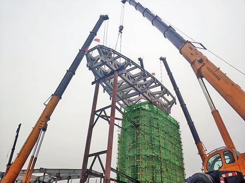 吊裝當天,四建集團4臺300噸汽車吊嚴陣以待,隨著指揮人員一聲令下,吊車開始進行整體抬吊。在空中,吊鉤與桁架對齊相連,4臺吊車同步提升,長24米、寬12米的大型桁架平穩提升至安裝作業點,經過施工人員不間斷作業,屋面桁架精準就位,終點塔的輪廓初現。