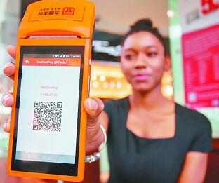 在加拿大多倫多約克戴爾購物中心,工作人員展示一名顧客所購商品的微信支付收款二維碼金額(加拿大元)。新華社發(fā)