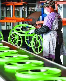浙江武義經(jīng)濟開發(fā)區(qū)的一家企業(yè),員工在生產(chǎn)線上趕制共享單車輪轂。新華社發(fā)