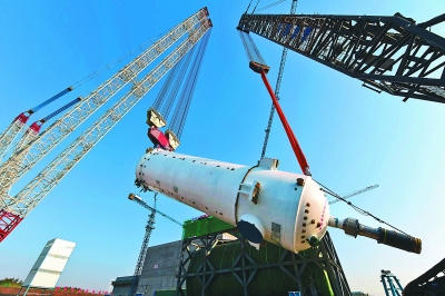 在華能山東石島灣核電廠,反應堆壓力容器進行吊裝。新華社發