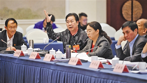 3月9日,人大河南代表團舉行全體會議,審議全國人大常委會工作報告。全國人大代表、河南豫劇院院長李樹建(左二)在審議報告時發言。(李景錄攝)