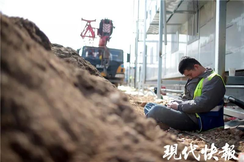 即便是在吃飯時(shí),工人們也不會(huì)離開工地,大家就在自己的崗位上捧起盒飯,大口大口吃起來。午歇時(shí),大部分工人都主動(dòng)加班工作,有人實(shí)在累極了,就地坐下小憩片刻,身下就是潮濕的泥土,他們也毫不在意。