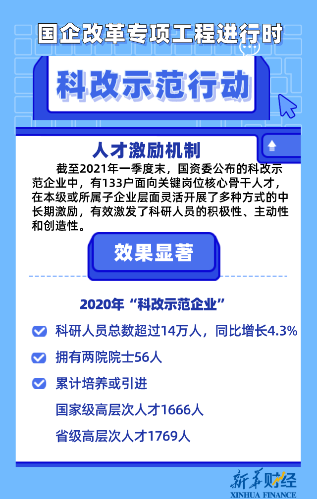 公開數據顯示,截至2021年一季度末,國資委公布的科改示范企業中,有133戶面向關鍵崗位核心骨干人才,在本級或所屬子企業層面靈活開展了多種方式的中長期激勵,有效激發了科研人員的積極性、主動性和創造性。