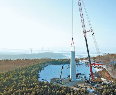 華電黑龍江區(qū)域哈爾濱依蘭雞冠山風(fēng)電場(chǎng)三期工程風(fēng)電機(jī)組吊裝現(xiàn)場(chǎng)。