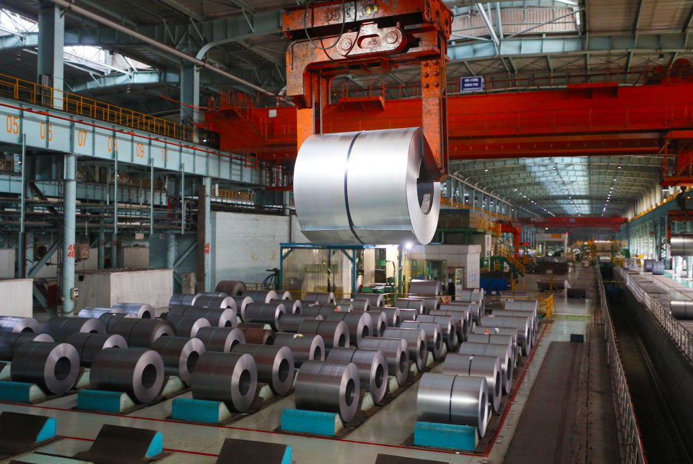 在本鋼冷軋廠,吊車在吊裝鋼卷。