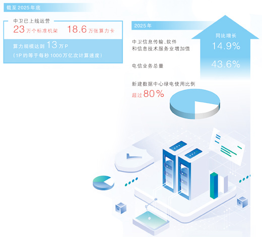 中衛(wèi)是寧夏算力產(chǎn)業(yè)的核心區(qū)。2023年以來,隨著人工智能快速發(fā)展和“東數(shù)西算”工程深入推進(jìn),企業(yè)投資需求激增,中衛(wèi)算力產(chǎn)業(yè)再次駛?cè)搿翱燔嚨馈薄V行l(wèi)市數(shù)據(jù)局副局長任濤說,截至2025年底,中衛(wèi)已上線運(yùn)營23萬個標(biāo)準(zhǔn)機(jī)架、18.6萬張算力卡,算力規(guī)模達(dá)到13萬P(1P約等于每秒1000萬億次計算速度)。