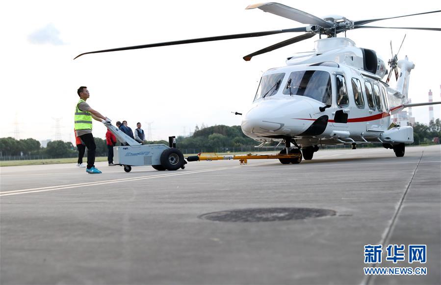10月20日,參加進博會展出的意大利萊奧納多直升機公司AW189型直升機降落在上海高東直升機場。(新華社記者 方喆 攝)