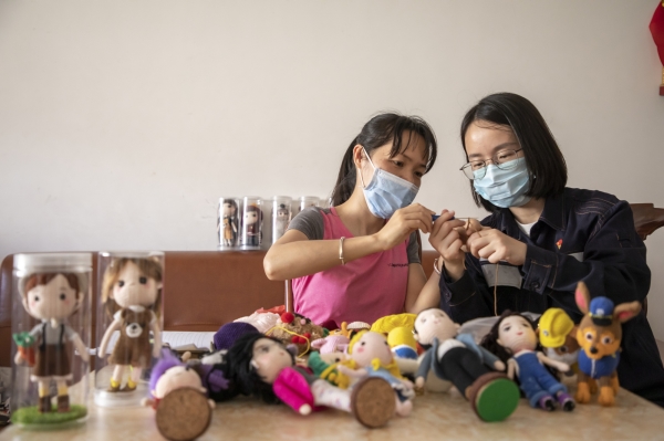梁曉君到貧困戶(hù)家中走訪,了解其自制手工藝品情況。(甄一飛 攝)